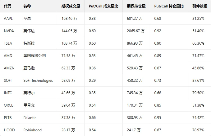 1. Apple The stock rose 3.94% in the previous trading day. The put/call ratio declined slightly the day before, and trading volume increased, indicating active bullish trading.
