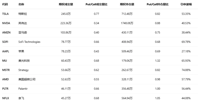 1. Tesla The stock fell 4.14% in the previous trading day, with the put/call ratio rising and trading volume increasing the day before.