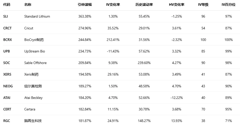 Top 10 most volatile US stock options (underlying asset market capitalization > $10 billion and option trading volume > 100,000 contracts)
