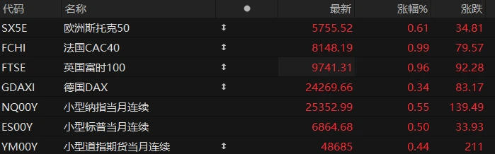 U.S. stock index futures rose across the board in pre-market trading on Monday, while major European indices also generally gained. As of press time, the Nasdaq... S&P 500 futures rose 0.55%, S&P 500 futures rose 0.50%, and Dow Jones futures rose 0.44%.