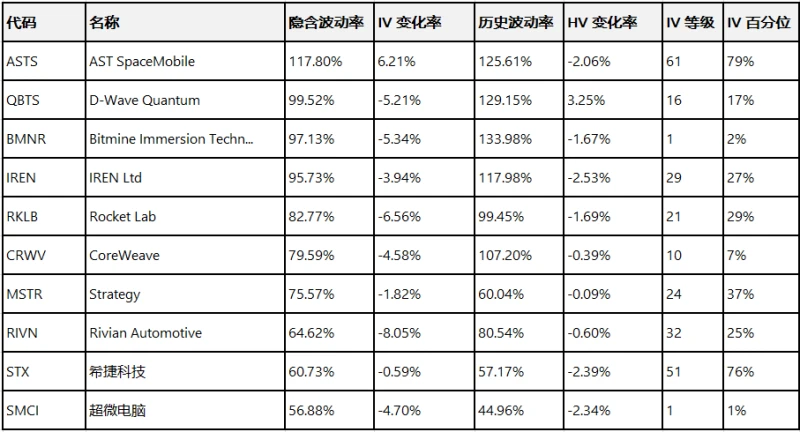 Top 10 most volatile US stock options (underlying asset market capitalization > $10 billion and option trading volume > 100,000 contracts)
