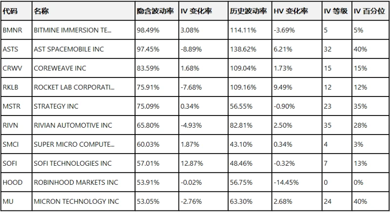 Top 10 most volatile US stock options (underlying asset market capitalization > $10 billion and option trading volume > 100,000 contracts)