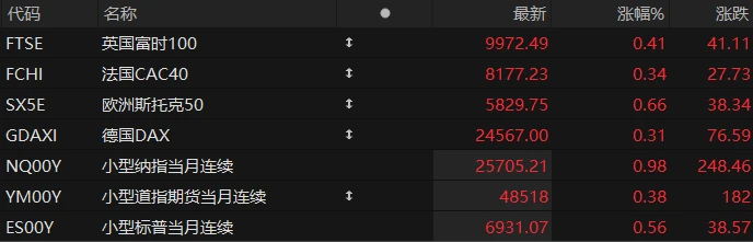 On the first trading day of 2026, US stock index futures rose across the board, and major European indices generally increased. As of press time, Nasdaq... S&P 500 futures rose 0.98%, Dow Jones futures rose 0.38%, and S&P 500 futures rose 0.56%.