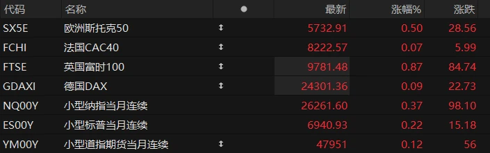 U.S. stock index futures rose across the board in pre-market trading on Wednesday, while major European indices also generally gained. As of press time, the Nasdaq... S&P 500 futures rose 0.37%, S&P 500 futures rose 0.22%, and Dow Jones futures rose 0.12%.
