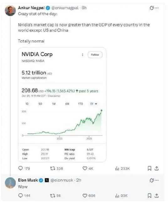 A netizen shared a screenshot on the social media platform X showing that Nvidia's market value once exceeded $5.1 trillion, and Tesla... CEO Elon Musk also expressed his admiration.
