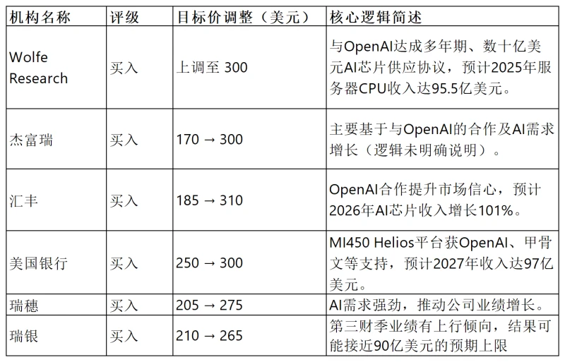 Institutional targets have generally been raised. The core bullish logic is highly consistent, primarily revolving around deep cooperation with OpenAI and AI chips. Strong demand growth and the market potential of new products.