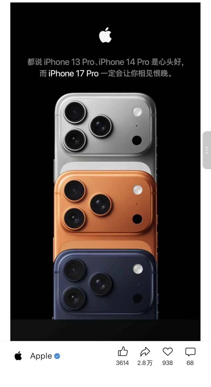 On November 6th, Apple The official WeChat account published a post titled "1314, why not 17 now?", using a pun to urge "iPhone die-hards" to upgrade to the latest model.