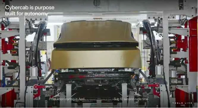 Tesla CyberDriver The Cybercab electric vehicle is Tesla's first Robotaxi commercial vehicle designed specifically for self-driving cars . It has no steering wheel, no pedals, and no rearview mirrors, and costs only a few cents per kilometer to operate. Musk stated that mass production of the vehicle will begin at the Texas Gigafactory in April 2026, with the goal of reducing Cybercab's roll-off time to under 10 seconds, theoretically potentially down to 5 seconds, and increasing annual production capacity from 500,000 units to 2-5 million units.