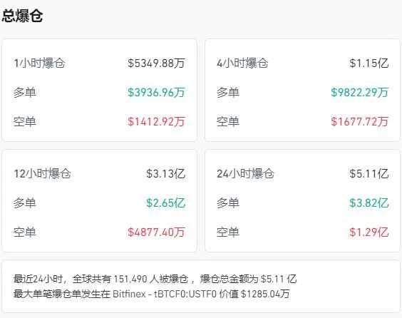 Bitcoin fell by more than 3%. Data shows that in the past 24 hours, a total of 151,465 people across the cryptocurrency network were liquidated, with a total liquidation amount of $511 million (approximately RMB 3.6 billion).