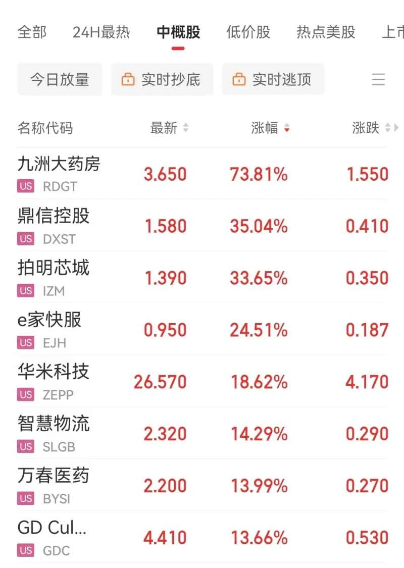 Jiuzhou Pharmacy rose 73.81%, Dingxin Holdings rose 35.04%, and Huami Technology rose 4.5%. It rose by 18.62%.