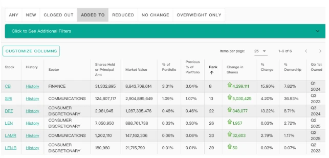 In terms of increasing its holdings, Berkshire Hathaway also increased its stake in Chubb Insurance in the third quarter. (CB), Lennar Architecture (LEN), Domino's Pizza (DPZ), Sirius XM (SIRI), Lamar Outdoor Advertising (LAMR) and other targets.
