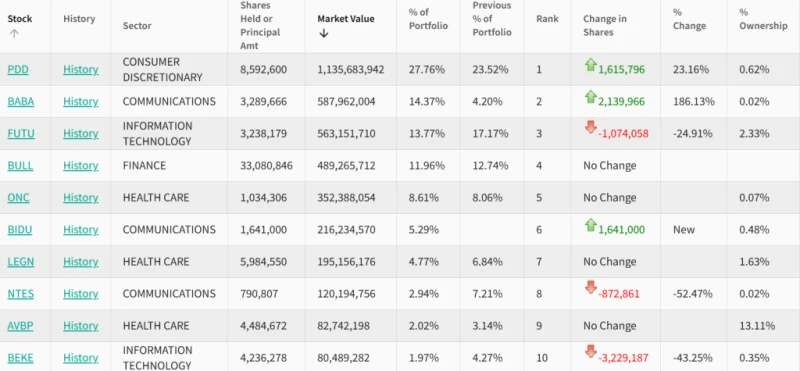 The top ten holdings are Pinduoduo , Alibaba , Futu Holdings , and Webull. Securities BeiGene Baidu , Legend Biotech, NetEase , ArriVent Biopharma, and Beike Chinese concept stocks accounted for 8 of the seats, highlighting their long-term optimism about high-quality Chinese assets.