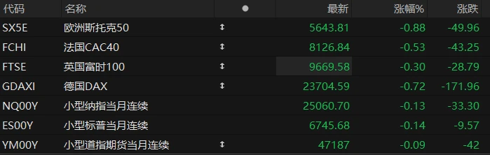 U.S. stock index futures fell across the board in pre-market trading on Monday, while major European indices also generally declined. As of press time, the Nasdaq... S&P 500 futures fell 0.13%, S&P 500 futures fell 0.14%, and Dow Jones futures fell 0.09%.