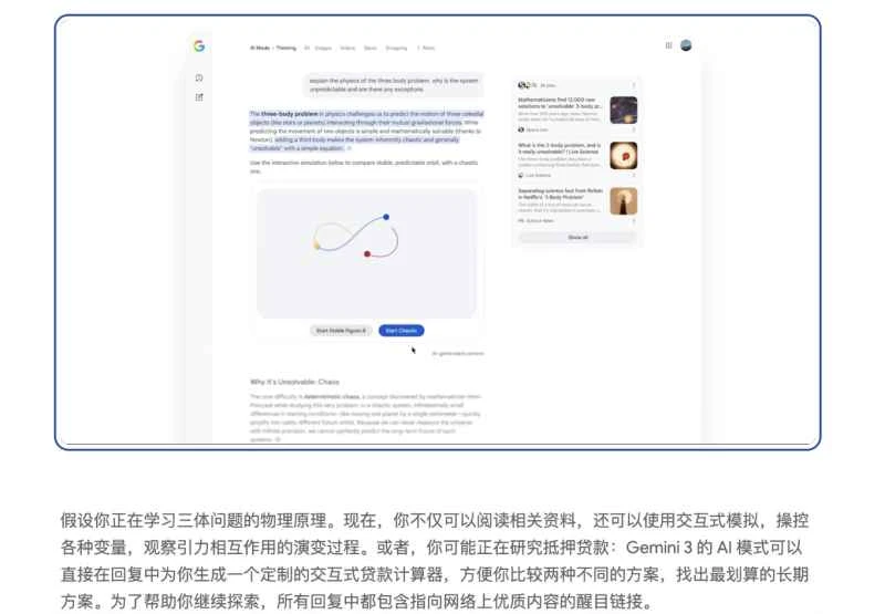 This means that the newly released model is mature enough to be applied in commercial scenarios. The official statement indicates that Gemini 3 brings strong inference capabilities to the search engine and unlocks a new generative UI experience, allowing users to obtain dynamic visual layouts using specially generated interactive tools and simulations.
