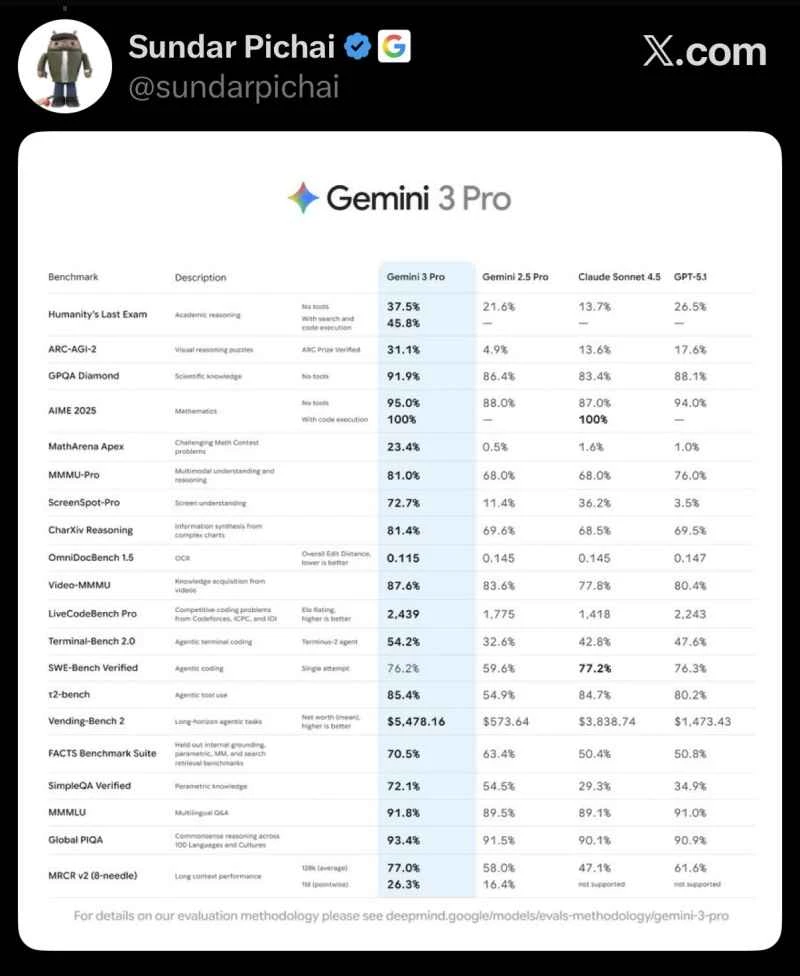 Even Google, known for its meticulous approach, has been unusually high-profile this time. The official blog post was titled "Opening a New Era of Intelligence," repeatedly emphasizing "best" and "most advanced." Google employees have also been actively promoting their product on social media, with CEO Sundar Pichai posting eight updates today about the Gemini 3.