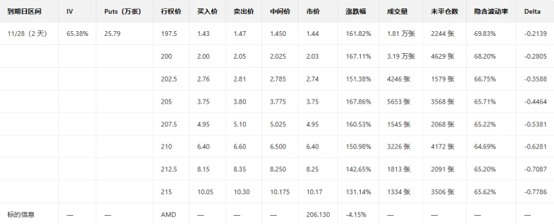 1. Advanced Micro Devices (AMD) fell 4.15% in the previous trading day, with the put/call ratio rising and trading volume increasing the day before.