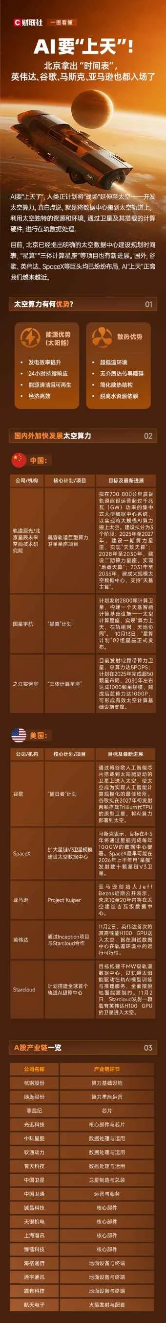 Currently, Beijing has proposed a clear space data center. Construction plans and timelines have been updated, with new progress on projects such as "Star Computation" and the "Three-Body Computing Constellation." Internationally, Google and Nvidia... Giants like SpaceX have already made their moves, making AI "into space" a reality.