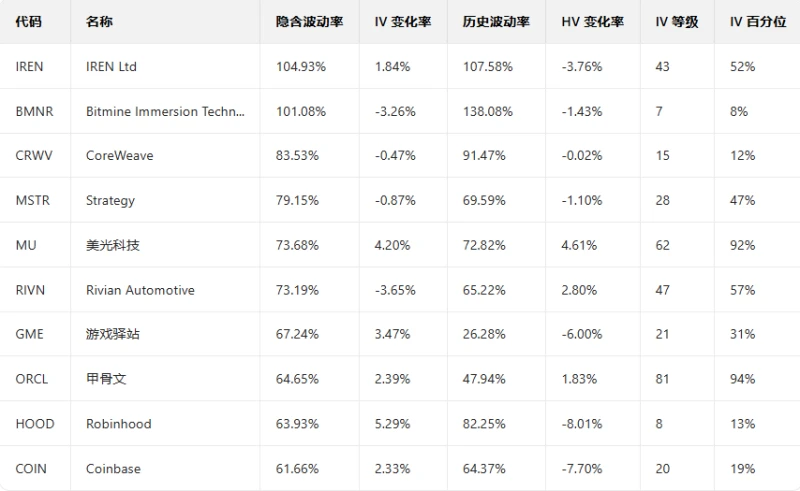 Top 10 most volatile US stock options (underlying asset market capitalization > $10 billion and option trading volume > 100,000 contracts)