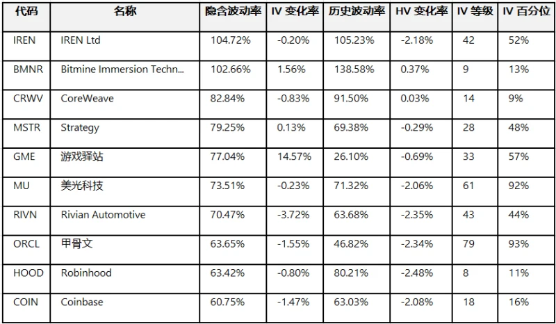 Top 10 most volatile US stock options (underlying asset market capitalization > $10 billion and option trading volume > 100,000 contracts)