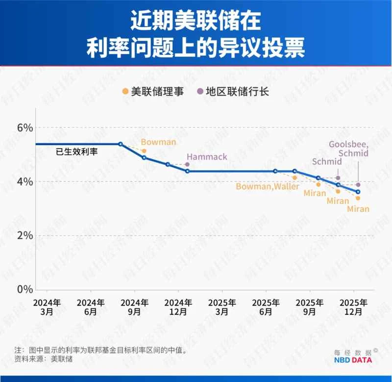 Regarding the 25 basis point rate cut, 9 out of 12 FOMC members voted in favor, while 3 voted against, the highest number of dissenting votes since September 2019. As the chart above shows, Federal Reserve Governor Stephen Miran advocated for a larger 50 basis point rate cut; while Kansas City Fed President Jeffrey Schmid and Chicago Fed President Austan Goolsbee believed that interest rates should remain unchanged.