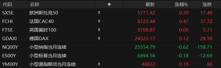 U.S. stock index futures traded in a narrow range in pre-market trading on Friday, while major European indices generally rose. As of press time, the Nasdaq... S&P 500 futures fell 0.62%, S&P 500 futures fell 0.18%, and Dow Jones futures rose 0.18%.