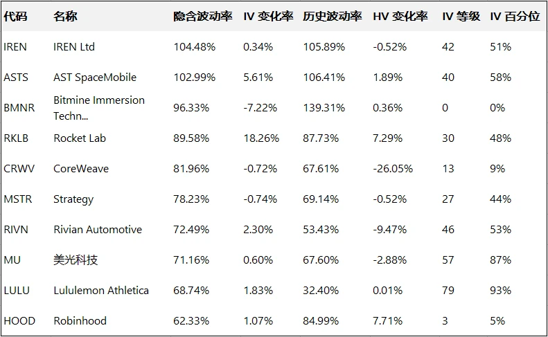 Top 10 most volatile US stock options (underlying asset market capitalization > $10 billion and option trading volume > 100,000 contracts)